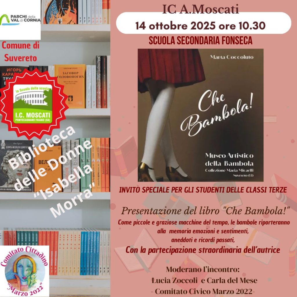 Martedì 14 ottobre alle ore 10:00 presso la Scuola Secondaria di Primo Grado Fonseca dell’Istituto Comprensivo “A. Moscati” gli studenti delle classi terze incontreranno l’autrice Marta Coccoluto che presenterà il suo libro “Che Bambola! Museo artistico della bambola Collezione Maria Micaelli Suvereto”.