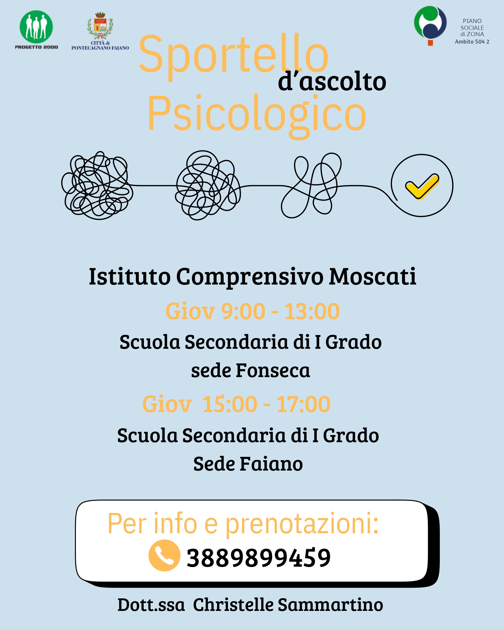 Si comunica l’avvio delle attività relative allo Sportello di Ascolto Psicologico con la dott.ssa Christelle Sammartino il giorno 23 ottobre 2025. Alle attività potranno accedere, tramite appuntamento diretto con la dott.ssa Sammartino, alunni/e e genitori della scuola dell’infanzia, primaria e Secondaria di I grado. I modelli per la richiesta sono nella sezione Carte della scuola sezione Modulistica.